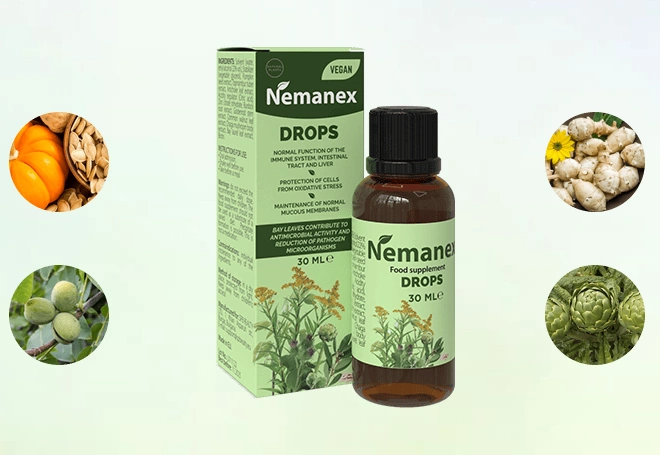 - Unterstützung der Immunität - die Pflanzenextrakte in der Zusammensetzung von Nemanex stimulieren das Immunsystem und erhöhen die Widerstandskraft des Körpers gegen Parasitenbefall und andere Infektionen.